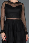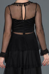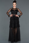 Black, Long Sleeves, Self Patterned, Printed Tulle , Maxi Dress, Tiered Dress, A-Line Dress, Evening Dresses