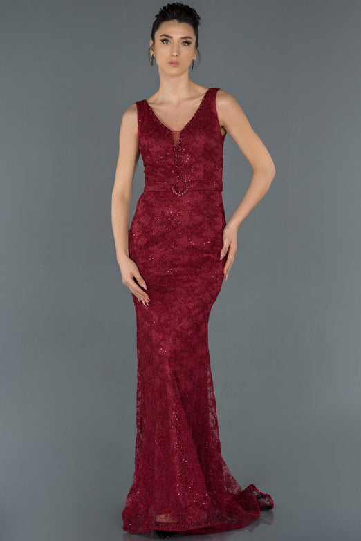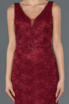 Burgundy, Sleeveless , Embroidered, Lace, Maxi Dress, Mermaid Dress, Evening Dresses