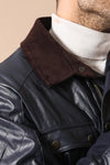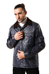 Product DetailNavy BlueSlim FitDiamond PatternedLeather Look JacketDrop 6Details: Zippered, 4 Pockets, Buttons, Leather and CachetFabric Content: 65% Polyester 35% Viscose