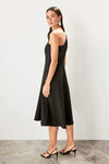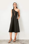 Black, One Sleeve, Plain Colour, Midi Dress, A-Line Dress