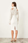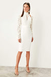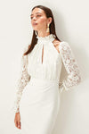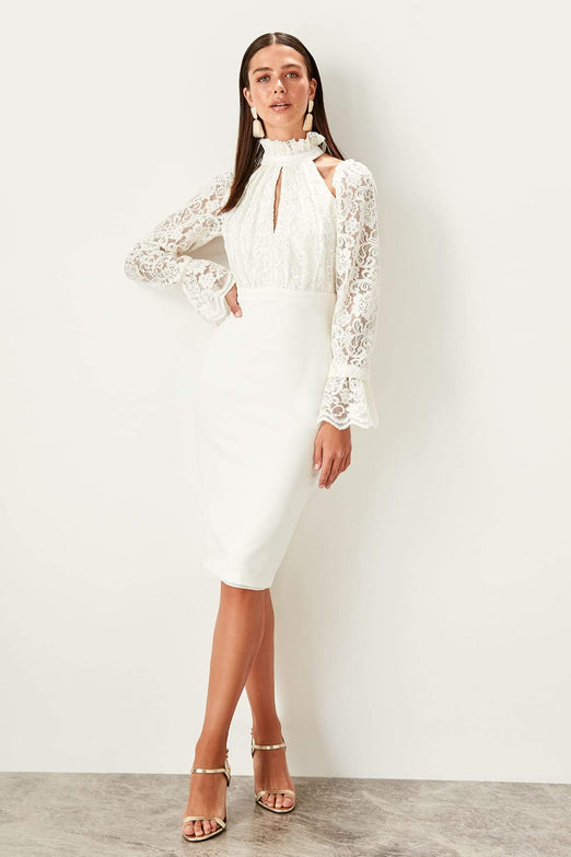 Ecru, Long Sleeves, Lace, Knee Length, Pencil Dress