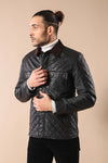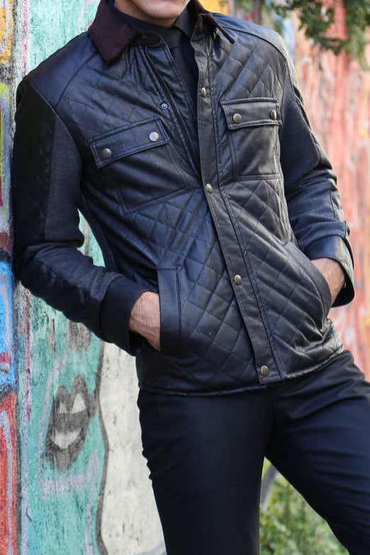 Product DetailBlackSlim FitDiamond PatternedLeather Look JacketDrop 6Details: Zippered, 4 Pockets, Buttons, Leather and CachetFabric Content: 65% Polyester 35% Viscose