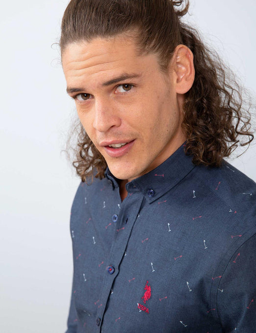 100% Cotton Navy Blue Patterned Slim Fit US POLO ASSN Men Shirt Buttoned Collar Height 188 Weight 77 Chest 98 Waist 82 Hip 97