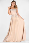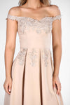 8558 Powder Off-Shoulder Pleated Applique Dress