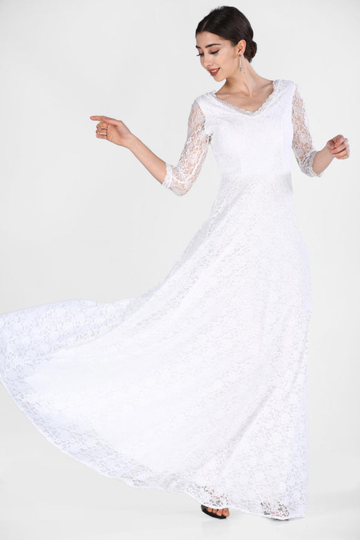 Product Detail Ecru, 3/4 Sleeves, Lace Dress, A-Line Dress, Maxi DressEvening Dresses, Cocktail Dresses, Bridesmaid Dresses, Matric Dance Dresses, Wedding DressesSample Size: Euro 36 / Small, Sample Length: 152 cm...