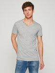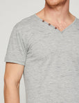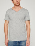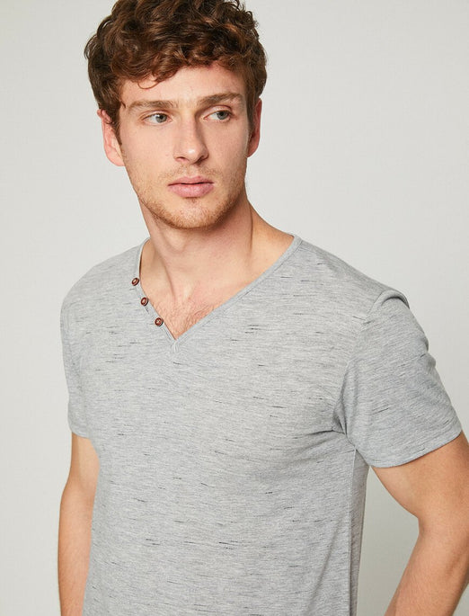 Product Detail Short SleeveV NeckNeck Detailed10% Polyester| 90% Cotton Model Measurements: Height: 187 cmBreast: 97Waist: 80Hip: 96Model Size: M Grey