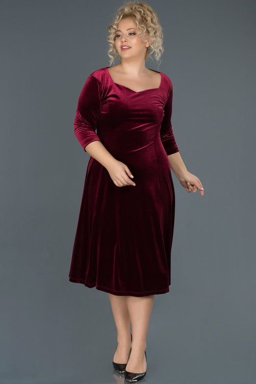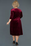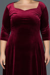Burgundy, 3/4 Sleeves, Plain Colour, Velvet, Midi Dress, A-Line Dress
