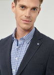 Product Detail Navy Blue50% Polyester 43% Wool 5% Viscose 2% ElastaneSlim Fit Classic Model Mono CollarModel Information: Height: 1.88cm Weight: 80kg Product Size: 50