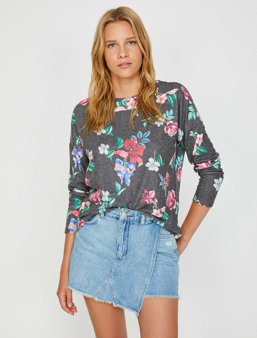 Product Detail Crew Neck Long Sleeve Floral T-Shirt 4% Elastane 48% Polyester 48% Viscose Model Measurements: Height: 180 cm Breast: 88 Waist: 64 Hip: 92 Model Size: S